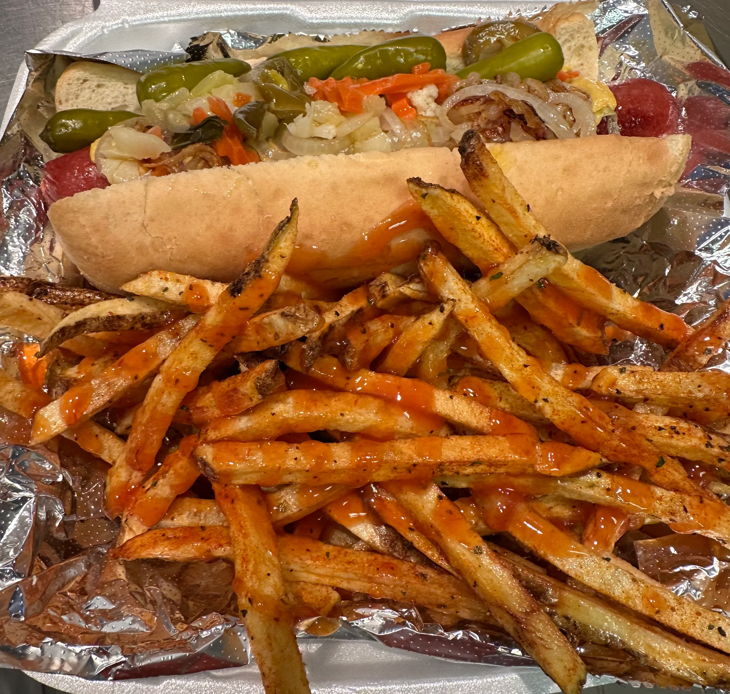 Grilled Vienna Beef Hotdog, Grilled Onions, Sport Peppers, Mustard On Bun With Citi Fries