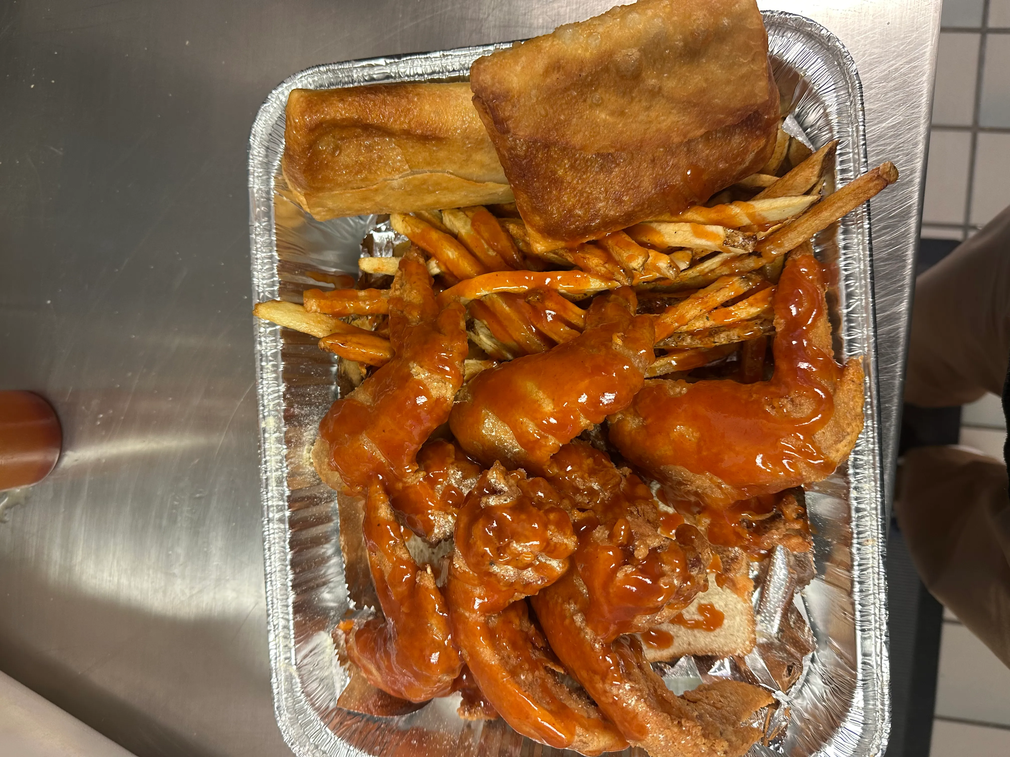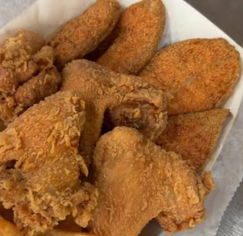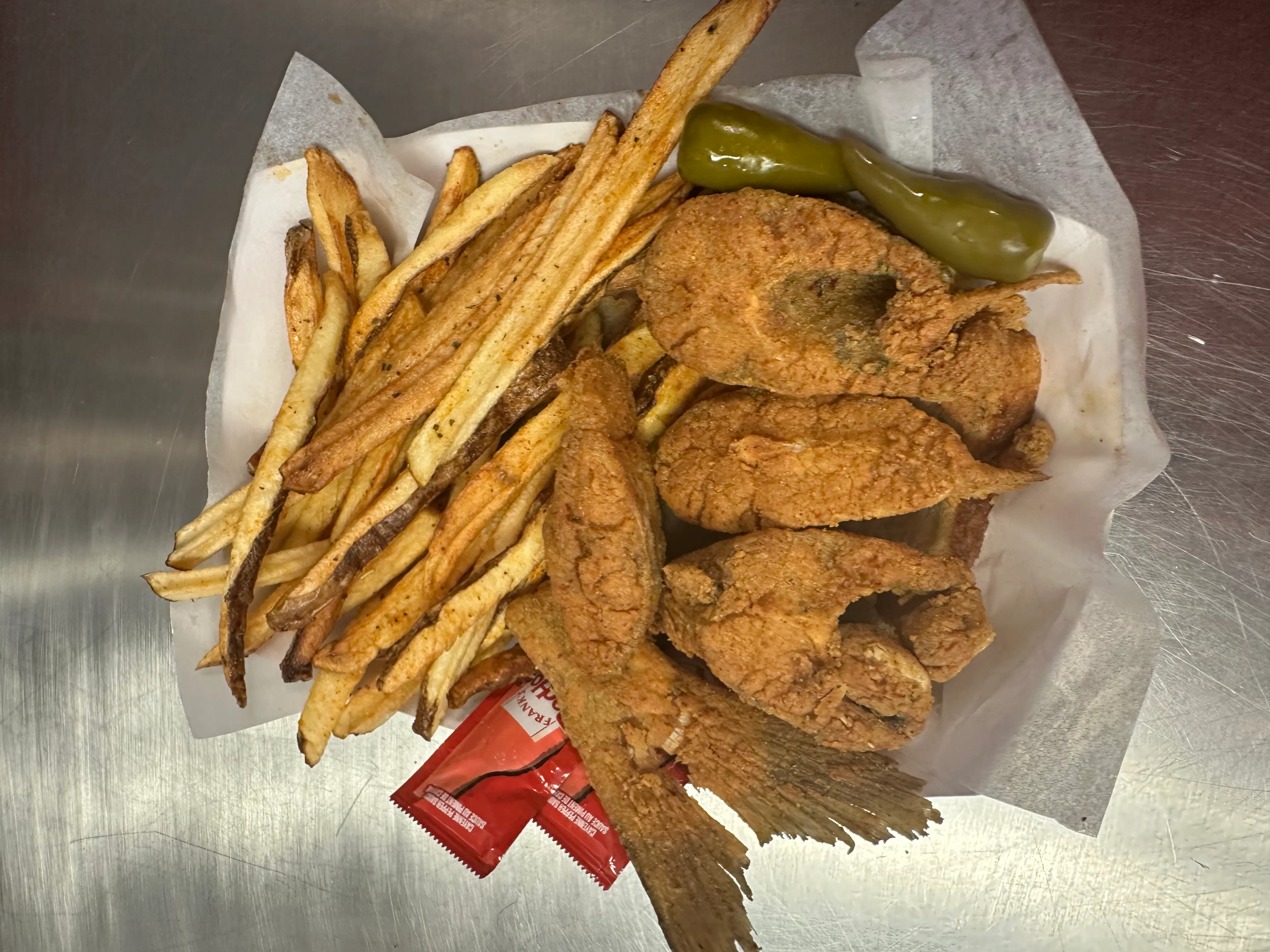 Deep fried steak cut catfish (5pc), 4 wings, fries, slices of bread, sport peppers, hot sauce, tartar sauce, 2 sodas