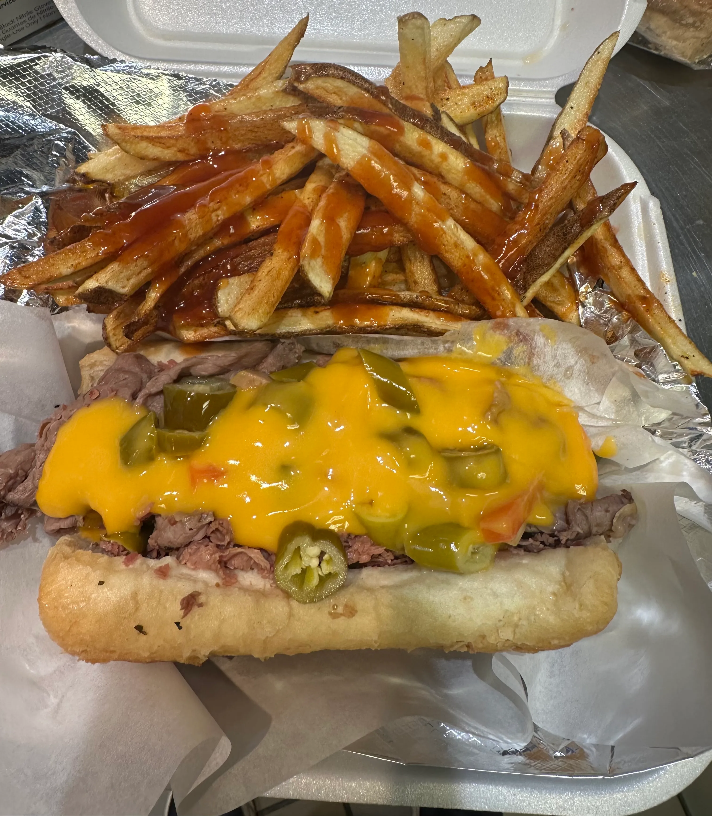 Corn beef, Roast beef, Gryo meat, hot peppers, mild peppers, mozzarella cheese, lettuce, tomatoes, mayo, mustard and tzatziki sauce in a sub roll with Citi fries.