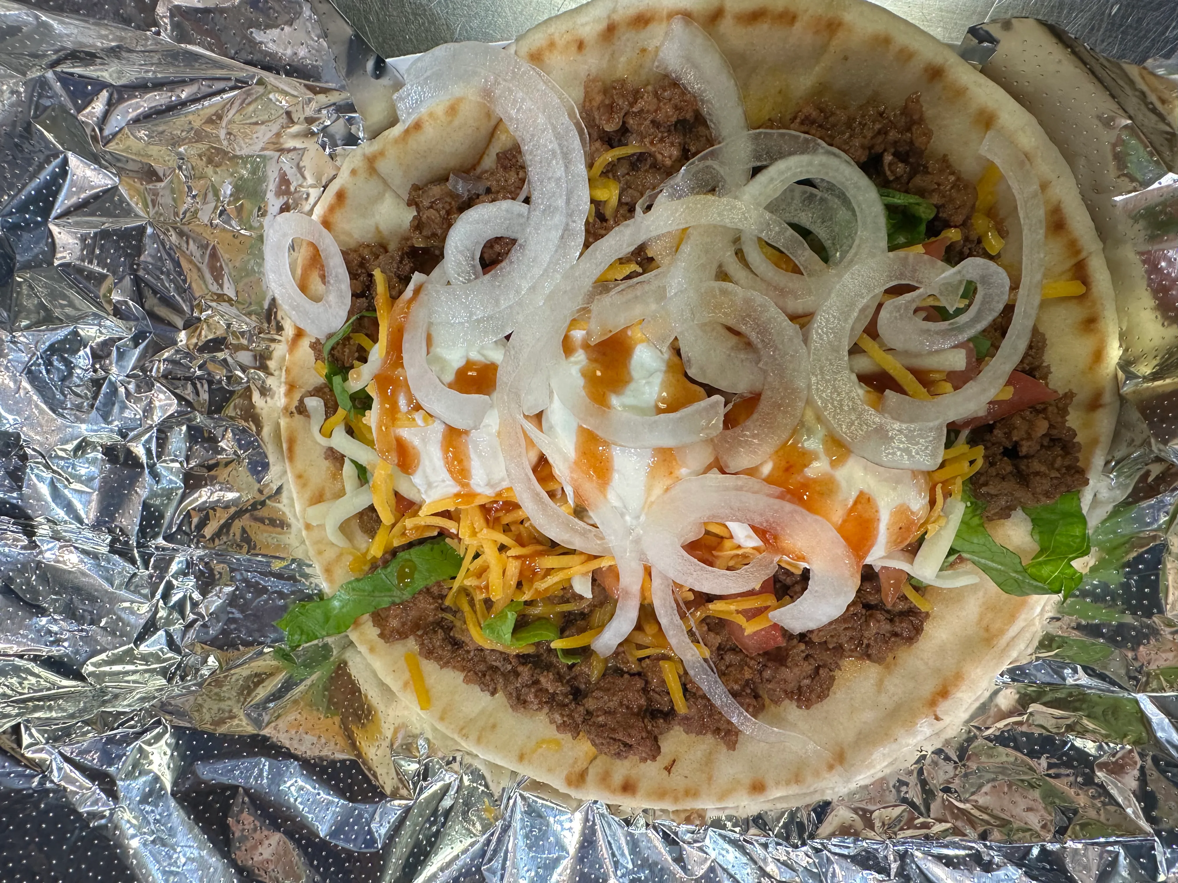 Seasoned ground beef, lettuce, tomatoes, shredded cheese, tzatziki sauce, sour cream, topped with mild sauce on a pita bread