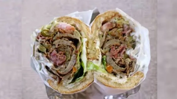 Grilled gyro meat, lettuce, tomatoes, onions, tzatziki sauce on a pita bread